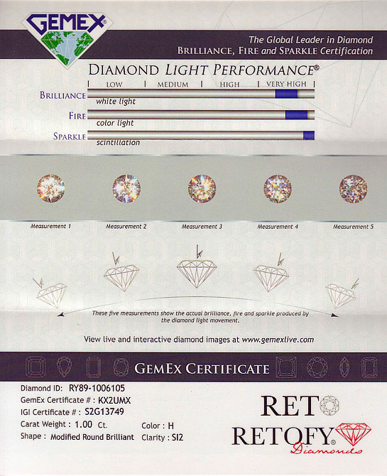 Certifikaci briliantů s 89ti fasetovým brusem RETO CUT 89 provádí světový lídr v oblasti hodnocení optických vlastnosti společnost GEMEX. Kromě uvedení základních parametrů 4C hodnotí zejména to, co dělá diamant opravdu krásným, jak se třpytí, láme, odráží a rozkládá světlo – brilanci, oheň a jiskření. V České a Slovenské republice zastupuje GEMEX právě naše společnost RETOFY.