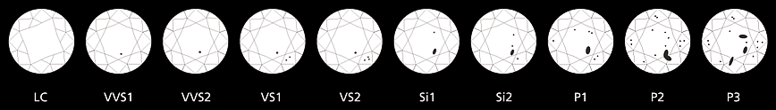 - P3 – rozsáhlé inkluze velmi snadno viditelné v diamantu pouhým okem, které mají značný negativní vliv na vzhled a soudržnost.