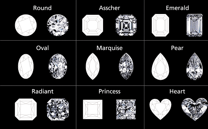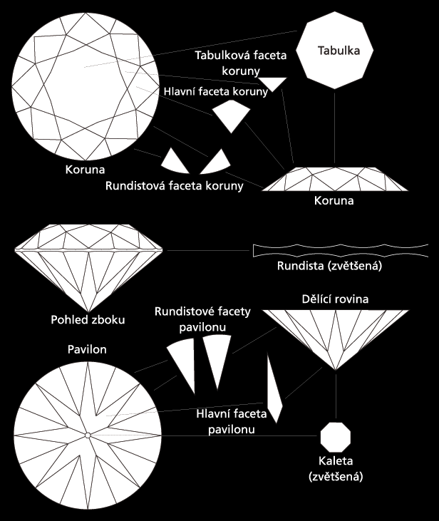 Nejčastějším tvarem je kulatý briliantový brus. Kulatý znamená tvar a briliant je typ brusu. Briliantový brus je typický tím, že má plošky ve tvaru trojúhelníku a deltoidů. |